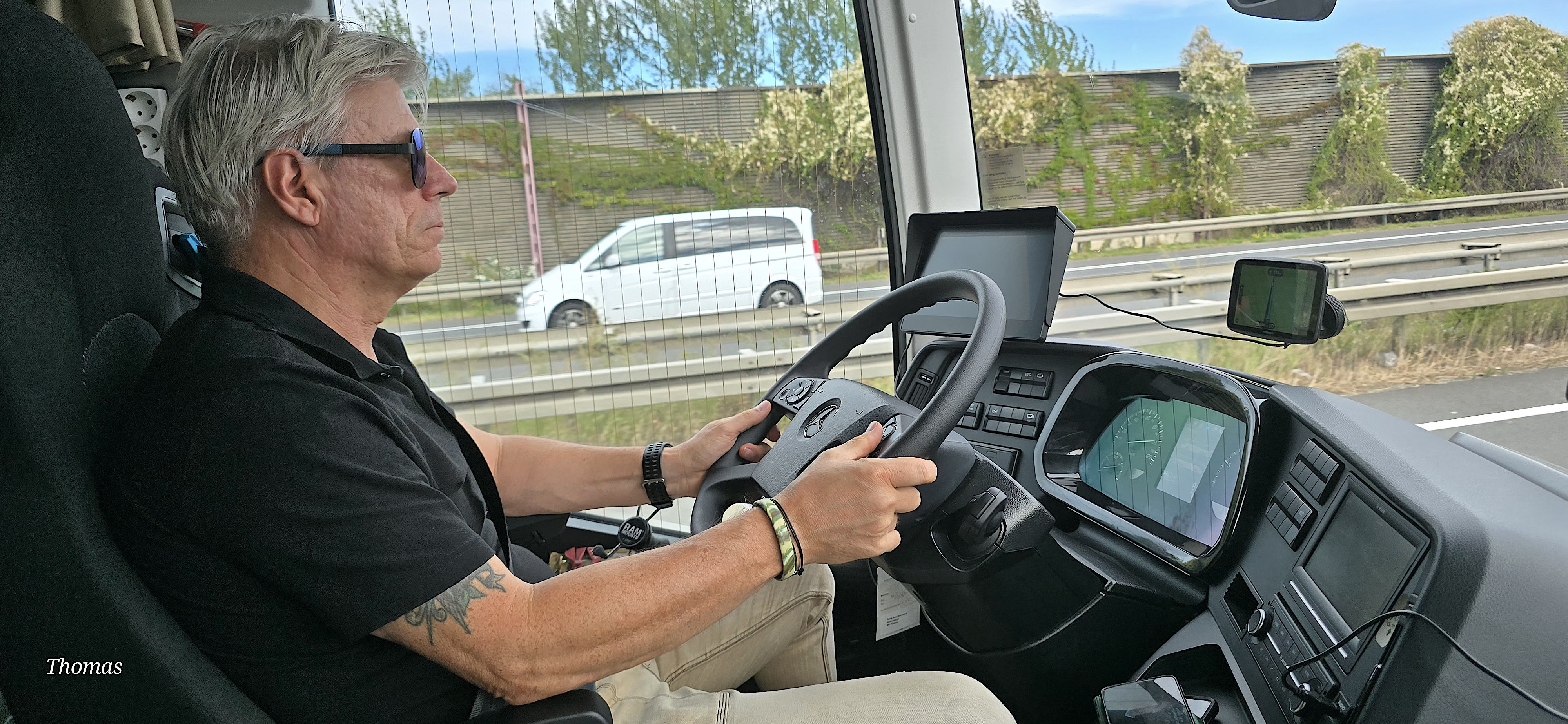 Op weg naar huis hebben we onderweg nog koffie met gedronken. Onze chauffeurs laten het zich smaken. En Gé houdt een van zijn laatste praatjes.