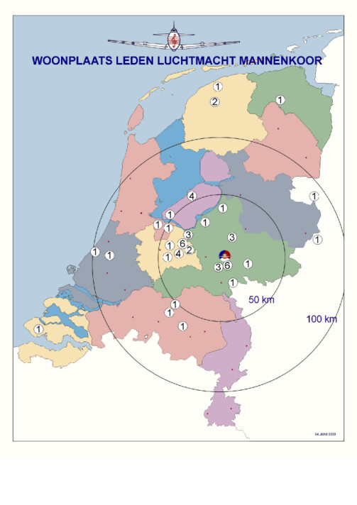 De leden van het koor komen uit het hele land en een paar wonen er ook in Duitsland. Dat weerhoudt ze niet om wekelijks te repeteren.Zie het kaartje hiernaast
