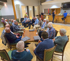 Op weg naar huis hebben we onderweg nog koffie met gedronken. Onze chauffeurs laten het zich smaken. En Gé houdt een van zijn laatste praatjes.