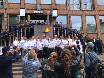 Als het vuur bijna ter plaatse is nemen wij plaats op de trappen van het stadhuis.
